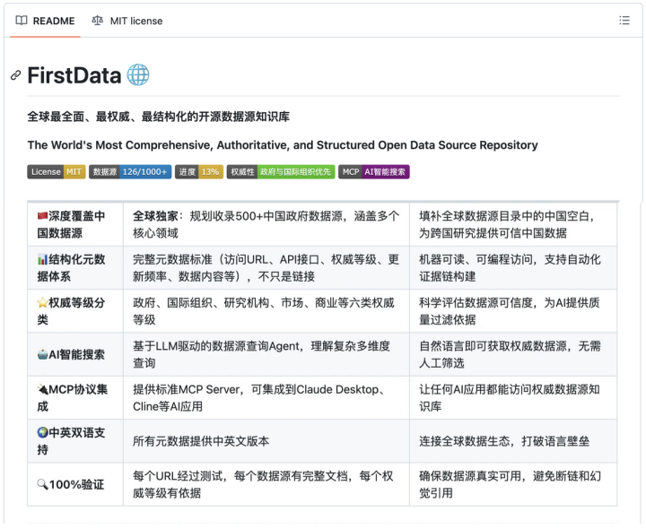First Data项目代码库虽然本身不存储、不包含、不直接提供任何原始数据文件,但收录了公开权威数据源,还采用了中英双语元数据设计,可提供相关数据的推荐查询路径。